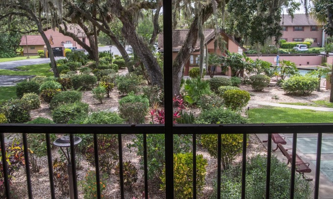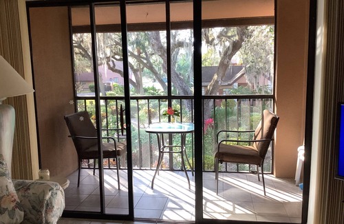 Just a few miles to lovely, historic Punta Gorda waterfront area (FISHERMAN's VILLAGE!) and the amazing new SUNSEEKER RESORT with excellent waterfront viewing/strolling and dining. It's also near about 20 restaurants in Port Charlotte. You can walk to supermarket and excellent donut shop, yet complex is quiet and beautiful. It's also GATED. Grounds have large oak, orange and lemon trees, along with acres of walking paths, as well as lovely flowering and other bushes. Also the grounds are on a canal. Condo has view of lovely garden and distant view of pool area.