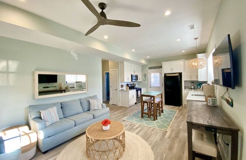 Inside: one story, no stairs; 2 bedrooms (1 king, 2 twins), plus queen sofa bed. Bathroom with dual vanity, oversized walk-in spa shower; TVs in all rooms with Amazon Firestick (Netflix, etc.), Wifi, workspace, washer + dryer, fully stocked kitchen.