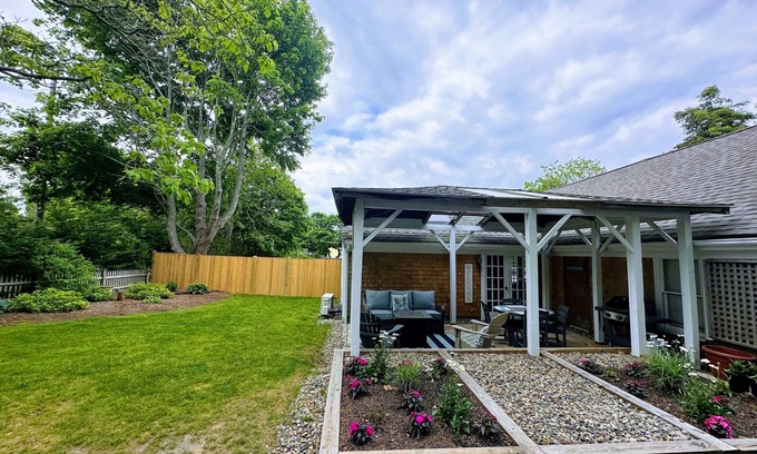 Located right on Rte 6A, one of the most scenic routes in all of New England, this sought-after area will be just the place for an authentic Cape Cod getaway! Turn into the quiet and charming neighborhood that abuts the property into your private driveway and entrance. Enjoy this fully renovated 2 bedroom, one bath property, equipped with two sitting areas, kitchen and breakfast bar. The kitchen is fully stocked with anything you may need: refrigerator, a Wolf countertop oven, 2 induction burners, coffeemaker and more! Please note, there is no standard oven, microwave or dishwasher but there is a brand new Weber grill outside. Eat outside under the beautiful terrace or cozy up next to the fire pit to enjoy the spacious and fenced-in backyard, perfect for grilling, bird watching, gazing at the stars or letting your kids play!