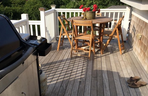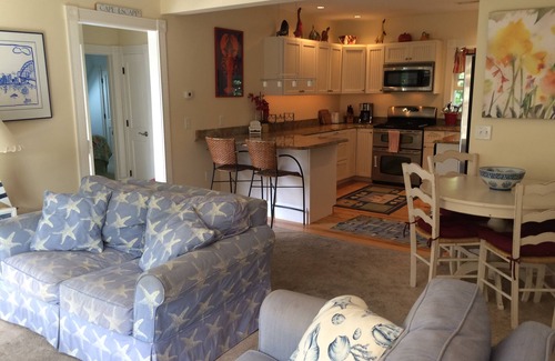 Pet Friendly! Two bedroom luxury vacation condo on second floor of home in the heart of Chatham Village! Head up the stairs to find a lovely deck with cafe table and gas grill. Open the door to your little piece of heaven: the open floor plan boasts a gourmet kitchen, including a breakfast bar for 2 and a table that seats 4, skylights, living area with flat screen TV, DVD, high-speed internet access, and central air. There are 2 master suites: one on each side of the living area-offering privacy to the occupants. Both offer bathrooms with showers. The first suite has a King size bed and the larger 2nd suite has 2 Queen size beds. Walk to Chatham village and the local beaches: Andrew Hardings, Lighthouse and Claflin Landing! Kayak or canoe in Mill pond-just a couple blocks from the condo. 2 parking spaces available.