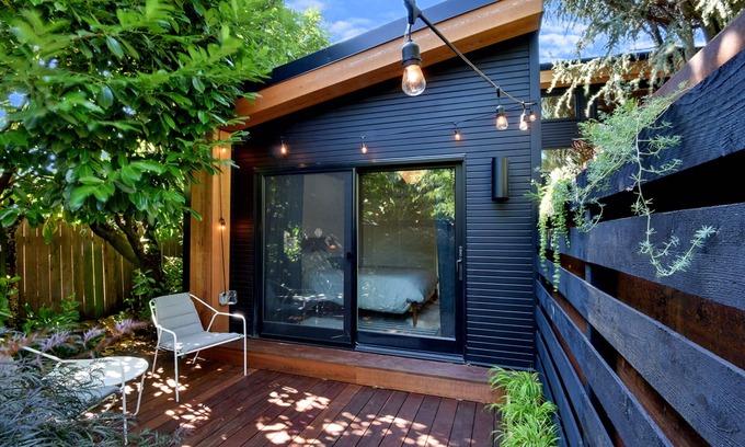 A modern design oasis nestled between forests of bamboo and pine yet steps to restaurant row on both Williams and Mississippi. Ample free parking available out front. Completely private detached / entire home. This house has been carefully architected down to the last detail: light filled with over a dozen windows yet all of them private / sky view or bamboo views! completely secluded and spacious and airy with 20 foot ceilings and everything you'd need. Sip coffee on your enclosed bamboo lined patio, walk to Portland's best foodie restaurants and shops! Mere Steps to restaurant row on N Williams and Shaver and bustling bars shops restaurants on Mississippi. Full kitchen, new bath, genuine mid century furniture and (real) art by local artists and a location that can't be beat! You are in for a true Portland experience here! I have lots of tips and recommendations too, but only if you need them: It would be my pleasure to host you! (note, all of the photos of restaurants, shops and bars are all less than 5 min walk away!)