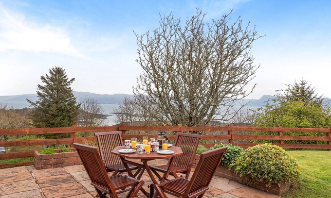 Admire the panoramic sea views that surround the property from your very own patio space. The paved patio features a small lawn beside it and outdoor furniture made for al fresco afternoons and evenings with incredible Scottish scenery in the backdrop.