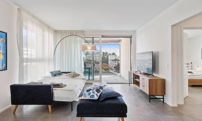Locarno: Large, modern residence "LocTowers", 9 storeys, built in 2021. 5 houses in the residence. In the centre of Locarno, in a central position, 600 m from the lake, 1.8 km from the river. In the house: lift, central heating system. Room cleaning on request (extra). Communal covered parking (extra) at the house. Dimension: height 210 cm width 275 cm. Supermarket 50 m, restaurant 200 m, pedestrian zone 400 m, bus stop "Locarno, Alle Torri" 80 m, railway station "Locarno SBB-CFF" 1.3 km, outdoor swimming pool 1.1 km, indoor swimming pool 1.1 km, lake Lago Maggiore 650 m. Golf course (9 hole) 1.2 km, tennis 650 m, minigolf 350 m, cable car 3.9 km, children's playground 400 m. Nearby attractions: Falconeria Locarno, Swissminiatur, Melide, Outlet Foxtown, Mendrisio, Madonna del Sasso, Orselina, Madonna del Sasso / Cardada, Castelli di Bellinzona. Well-known ski regions can easily be reached: Bosco Gurin. Well-known lakes can easily be reached: Lago Maggiore, Lago di Lugano, Lago di Orta (IT). Hiking paths: Valle Verzasca, Valle Maggia, Valle Onsernone, Centovalli. Please note: the photo is just an example. Additional accommodations can be booked. Property ref. CH6600.60 is situated on the same property.