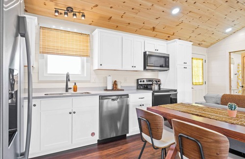 This gorgeous "safari lodge" has everything you need for a getaway in Williamstown KY! Inside the home you will find a lovely kitchen, supplied with all the basic essentials for everyday cooking, with a full oven, refrigerator, microwave, toaster, and coffee maker. Coffee grounds and tea bags are also provided! In the main living space there is a comfy pullout couch bed, a tv with cable, a dining area, and an adjoining full bathroom. There are two bedrooms with queen beds, one of which has a private, full bathroom with a walk-in shower!