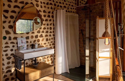 Vous y trouverez : un lit suspendu ,douche à l'Italienne, toilette sèche, coin salon, cuisine toute équipée comprenant : cafetière ,bouilloire, plaque gaz, four, grille pain, planche et fer à repasser, sèche cheveux, étendoir ainsi qu'un lave linge.