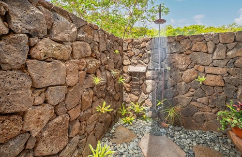 Situated on a private walk up cul-de-sac within walking distance from The Club at Kukui’ula, Bungalow 1A allows guests to experience well-appointed one-bedroom tropical living. The living area and galley-style kitchen feature top of the line décor and appointments, from the Wolf range to the built-in Sub Zero refrigerator and counter seating for two. With high ceilings and ample windows, the living area opens onto a cozy outdoor lanai with dining area and comfortable seating for reading a book or watching golfers on the private course. Spending evenings grilling on your lanai and enjoying a cocktail. Inside, the bedroom has a king bed, large bathroom with double vanity, deep soaking tub, indoor shower and private outdoor lava rock shower.