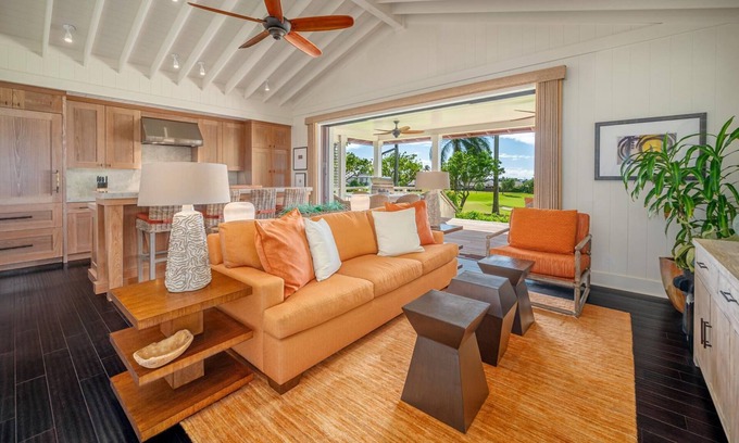 This vacation rental boasts 1,787 square feet of open-concept living space, featuring sleek design, high-end finishes, and a harmonious blend of indoor and outdoor living. The inviting living area is tastefully furnished with comfortable seating and adorned with tropical accents, providing the perfect place to unwind after a day of adventure. Large windows flood the space with natural light and offer views of lush landscaping, bringing the beauty of Kauai inside.