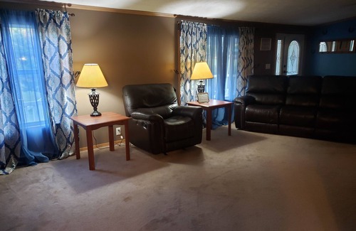 The lodge can sleep up to 8 comfortable yet has enough room to add a air mattress or two. Plenty of room to relax inside or outside. The lodge sits on 15 acres. Covered front porch and a deck out back. Only 3 miles from Kinkaid Lake and Shawnee National Forest and a Saloon within walking distance. The only thing you need to bring is your clothes, bathroom products, food and beverage. We do not have floor fans so if you need something like that you will have to bring . You will pick up the keys and code for the garage at the Longbranch Saloon the day you check in. We open at 12