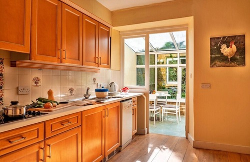 Lodge Cottage is a traditional character-filled Cotswold cottage, parts of which are 300 years old. This delightful cottage is the perfect getaway for small families or couples. Lodge Cottage also welcomes one well-behaved dog during your stay. This cottage is equipped with modern conveniences to ensure a comfortable stay, including central heating throughout.On the open-plan ground floor, you'll find a warm oak floor, an inviting open fireplace, and comfortable sofas perfect for relaxing. French doors open out to the charming cottage garden. The private, south-facing walled garden includes a swing, a dining table, and chairs on the terrace, which is accessible from both the living room and sunroom.The fully equipped kitchen boasts a dishwasher, a double oven, a separate microwave, and a spacious refrigerator-freezer. Adjacent to the kitchen, a south-facing sunroom provides a cozy spot for breakfast or afternoon tea, with a table and chairs. Also on the ground floor are a convenient half-bath and a utility room with a washer-dryer. The living room features two comfortable chairs and a sofa, arranged around a log fire. The dining area includes a solid oak dining table that seats 6–8, perfect for hosting meals, and an antique desk in a quiet corner for working or reading.The cottage accommodates four guests. It features a spacious double bedroom with a king-size four-poster bed, a sofa, and charming views of the nearby church. The room includes ample storage and an en-suite bathroom with a toilet. The second bedroom offers twin beds (which can be linked to form a double), lovely south-facing views, and access to a large family bathroom with a shower over the tub.For families with young children, the property provides a baby gate, highchair, and pack-and-play. A larger crib or newborn cradle is available upon request for a $20 supplement.Parking is available in the gravel courtyard outside Lodge Cottage. A short walk around Kingham Lodge House leads to an indoor pool and access to five acres of gardens, which are open to all Kingham Cottages guests.The owners at Kingham Lodge have 5 holiday cottages available on site for large gatherings sleeping up to 26 people. Do call us about booking multiple cottages for a large family celebration.There are 5 cottages on site and operate a private 'swim time' for each individual cottage, so all groups of guests have private family time in the pool. Your time changes each day and this information is shared with you in your booking confirmation email. You can also enjoy an early morning swim that is open to everyone. The pool is used by Kingham Lodge owners only after 4:30 p.m. Pool towels are provided for you in your cottage and the owners will give you a pool safety briefing on arrival.