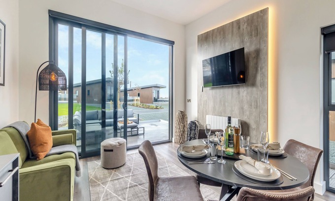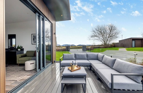Shower Room: Walk-In Shower, Heated Towel Rail, Toilet. Solar panel central heating, electricity, bed linen, towels and Wi-Fi included. Welcome pack and doggy extras.. Front garden with sitting-out area. Garden furniture (Apr-Oct). 2 small dogs welcome, to be kept on lead at all times. Electric car charging point (shared with other properties on-site). Private parking for 2 cars. No smoking. Please note: No children under 8 years old, except infants.. Each lodge has been finished to an exceptional standard, with high-end furniture, and handmade kitchens. Luxury is at the forefront of each stylish lodge. This private collection of lodges is a peaceful retreat, you will certainly have a break to remember. A private seating area is situated on the decking area, a lovely spot to relax after your day of sightseeing.
