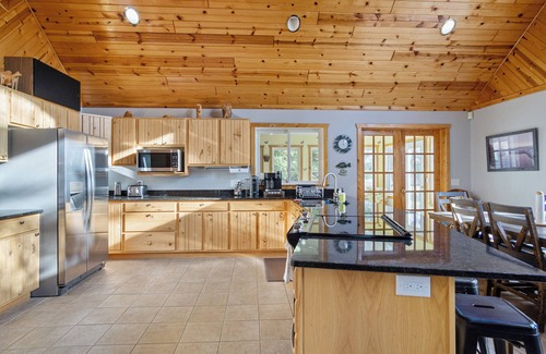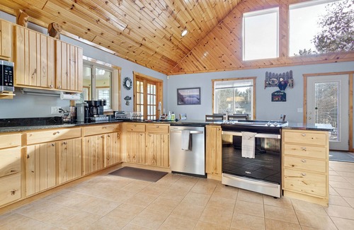 No 'roughing it' here. Rent this gorgeous house, fully-equipped, built in 2001, 3 bathroom, on-suite master bedroom with whirlpool tub, gameroom, sunroom, fireplace, airconditioning, stove, microwave, oven, dishwasher, 2 refrigerators with ice-making, ice-dispensing thru door, washer & dryer (no extra charge), loft, 6 bedroom lake home rental with a boat dock and frontage on quiet area of Pine Lake connected to Lake Holcombe. Boat launch, sandy beach (15 minute walk) and golf course within 2 miles. Easy access to snowmobile trails.