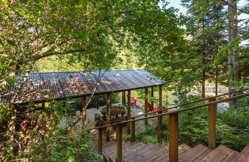 Outside relax in the Adirondack rocking chairs, wood table and deck with waterfront views. Watch eagles and ospreys soar by, plucking a fish out of Boyer Slough and Kootenai Bay. Saunter down the short path to the waterfront where you'll discover a true Teepee (available during summer months only - kids will love this and can sleep in the Queen bed inside). At the water's edge enjoy an incredible Cabana (with dart board, table and chairs, refrigerator -- see photos -- and yes it has Edison bulb lights wrapped all around for night time use). Make s'mores around the massive firepit and kids will love the new sandy beach. For summer months, 2 large stand up paddle boards (SUPs), 1 small stand up paddle board and 2 kayaks all included at no extra charge. A private dock with large boat lift allows you to safely moor your own boat - or rent ours!