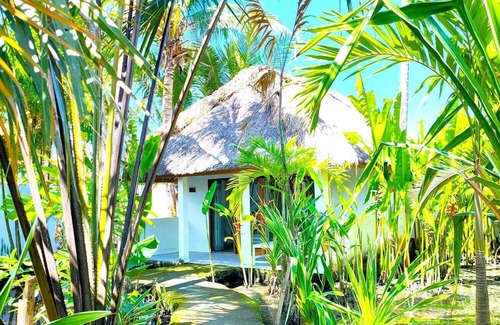 Individual bungalow at Alang Alang roof overlooking a luxurious garden and swimming pool.
