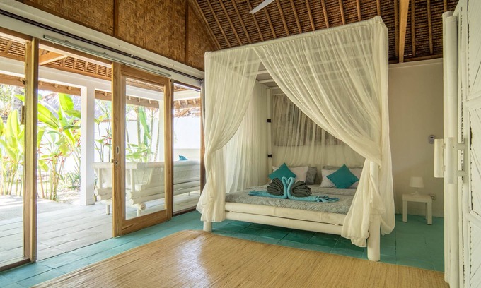 In an intimate setting, individual secluded lodge with king size bed with sofa. indoor lounge area. Alang Alang ceiling, mosquito net, closed. semi-open bathroom with hot water, amenities, towels and a wide mirror. relaxation area with wide outdoor sofa, private terrace with a bamboo shade. Mineral water.