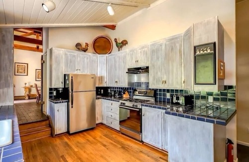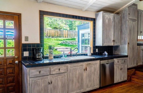 From there, it's just two steps down into the kitchen, which is full of charm and unique details. There you will find stainless steel appliances, a fully-tiled counter and backsplash and a large over-the-window sink with views of the backyard. The chef in your group will be delighted to find that the kitchen is also fully stocked with everything they need to whip up a favorite recipe or meal, from a toaster to a blender to a coffee maker, and will be able to serve with ease thanks to the close proximity of the dining table. When not needed for a delicious meal, the dining table is also perfect for setting up a puzzle or game.
