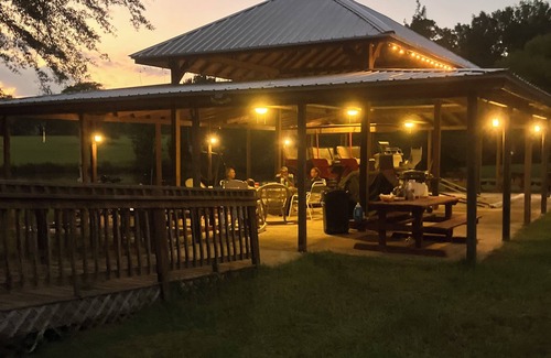 Rustic 5-bedroom lodge in Pine Mountain. Here there is a variety of sleeping arrangements. Spacious Picturesque log-cabin lodge with a wrap-around porch overlooking a private lake on beautiful Big Bear Farm, great for events, small conferences, and day retreats. Events (more guest then VRBO lodging) are scheduled directly with us. The large venue room can accommodate 150 people and boasts a beautiful gas fireplace with vaulted ceiling and exposed timber beams. 2 bathrooms flank the back of the great room with both interior and exterior access. Commercial kitchen with Artic Air fridge/freezer, convection oven, gas stove, Hand & vegetable sinks--all you need for hosting! Coffee and tea prep station. Two downstairs bedrooms with attached bathrooms (one handicap accessible) Upstairs an additional 3 bedroom with 2bathrooms. Can be rented as a 2 bedroom, 5 bedroom or event center. Pavilion on property can be rented with venue room or as a separate venue space and lodge. 1 ADA room with a queen bed, 3 of the rooms have2 twin beds that can be connected to make kings, one room with a Queen, and 2 queen cozy futons. With 5 bathrooms, each equipped with a bathtub, guests will feel right at home. The property also offers convenient amenities like an iron, washing machine, heating, and AC. It's easy to see why you'll be able to unwind at our place. Schedule separately with Big Bear farm where you can stable your horses and enjoy the competition facility with cross country and trails. If you don't have a horse you can take lessons while you are here or schedule a farm tour. Also available in the local community is Callaway Gardens, FDR State park, Little Whitehouse, antique stores, Wild Animal Safari, West Point Lake and many other beautiful places to visit. Priced for up to 6 people. There is additional charge per guest above 6 people. If for a couple please message me for a discount for 2 people or using the downstairs only. Thank you and have a blessed day!