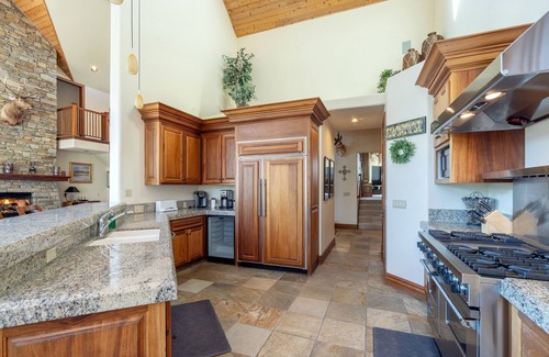 The chef-friendly kitchen boasts high-end stainless steel appliances by KitchenAid, Sub-Zero, and Viking, these include a double oven, a six-burner stovetop, and a charming wine fridge. The kitchen enjoys a plethora of natural light and stunning views thanks to its large picture windows. Here you'll also find a gorgeous granite-topped island bar that offers abundant space for food prep. In addition, you may enjoy meals at the formal dining table with mountain views or at the breakfast bar that has barstool seating for four.