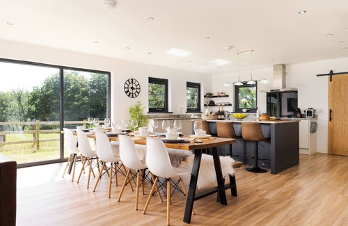 The large windows frame the panoramic views and the bespoke kitchen is a culinary haven, with a large central island perfect for family gatherings. Cosy evenings can be spent in front of the crackling log burner.