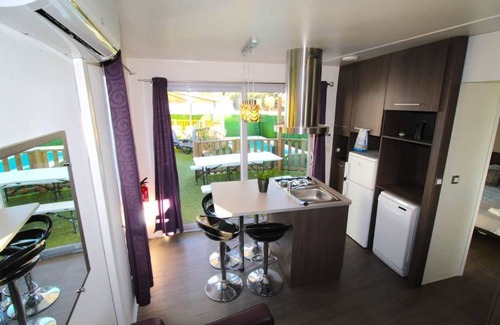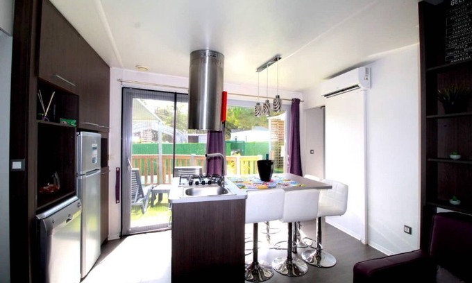 Discover without delay this new rental broken down into 2 modules communicating by the wooden terrace with a living area of 75 m² this cottage has a capacity of 11 people: 1 master suite with kitchen and living room & a module of 2 suites with kitchen and living room.