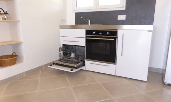 House of 64m² (sleeps 4) composed of a living room with open kitchen, a living room (sofa), a bedroom (a bed 2 persons), a bathroom with walk-in shower (machine to wash), independent toilet a mezzanine with two beds of a person.