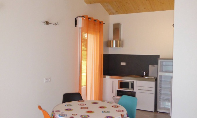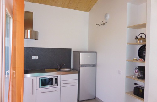 House of 50m ² (2 beds) on one level composed of: a living room with sofa, 1 open kitchen, 1 bedroom (bed for 2 people), 1 bathroom with walk-in shower and toilet. . (washing machine)