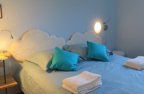 A room with bed 160, a second room with two beds 90 can be twinned. We can do two extra beds in the living room. Cot and baby accessories on request.