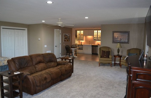 Enjoy this spacious 1500 sq. ft. room above our country home. A flight of stairs is the only access to a spacious room located on 80 acres of Kansas farmland. The studio room includes a full kitchen, bath, laundry room, a king-sized bed, and a large open living area to relax and get away from the distractions of everyday life. There is an office desk and Internet if you feel like staying in touch during your time off.