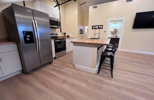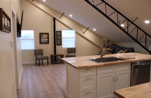 Upstairs apartment has two bedrooms (1 King, 1 Queen), 1 bathroom, full Kitchen, Living room with a pull out queen sofa, porta-crib, and Laundry room with stackable washer and dryer. This is an open concept apartment with Barn style doors for the bedrooms.
