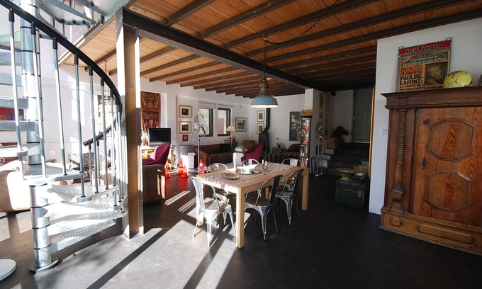 Ground floor : open space (industrial look with glass, wood, concrete, metal beams in 3 m height) with large living with 2nd bed and dining room and fully equipped kitchen plus bathroom/ toilet and laundry-heating-room. TV and Wifi.