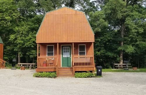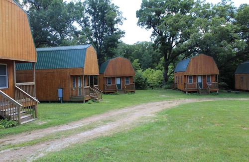 Cabin #2 of 5 tastefully decorated family cabins available with a 'fun' loft to sleep up to 8 guests. On the front porch is a rocking chair and pew for sitting out on starry nights. Rural area with many wildlife, but close to many attractions, including but not limited to the Mississippi town of Muscatine, Iowa. Many activities at the camp, with acres of timber and trails that run along the Cedar River. Plus horseshoes, basketball, sand volleyball, regular volleyball, tether ball, playground, In high season there will be a concession stand, outdoor movies and activities. Cabins are heated and air conditioned for comfort. All cabins have fire pits, grills and picnic tables.