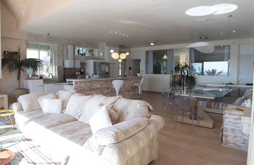 On the floor of our villa (but completely independent in every way and without any opposite,) the loft which is two hundred meters, is an open space, bright and friendly. The beach, the sea, you can admire, without any obstacle, your bed (3 bedrooms), your bath, (suite) stay, kitchen, with your meals and not forgetting the two large terraces (80m2) planted in part (a lawn area where you can lie protected by the amber of a beautiful palm tree) .Two rooms each offer a bathroom and a bed of 1m80. the third bedroom, also with its own bathroom, has three single beds. Between the dining area (for comfortably 10 people) and the modern and functional kitchen, a large bar invites to contemplation. Without forgetting a beautiful fireplace (which draws wonderfully) for a beautiful and romantic evening of winter lovers or friends .