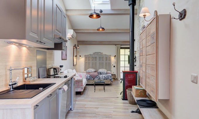 The beautiful loft studio "Atelier" (33m2) impresses with its modern country house style, its very high ceilings and warm natural colors and beautiful light. It has a beautiful private bathroom in the original natural stone shower. In the very large king-size bed (180x200) our guests can relax or take a rest on the small, private wooden floor terrace. This loft is air-conditioned and on ground level.