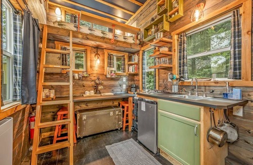 Experience the magic of tiny living in our most popular accommodation at the Retreat! Spend your days hiking Beaver Falls, relaxing in the sauna, or lounging on the spacious deck. Inside, cozy loft bedrooms invite you to nap or dive into a book from our unique library. With two lofted beds, a hot shower, plenty of dining space, and a fully stocked kitchen, this stylish space has it all. Pure relaxation and comfort await in the heart of nature.