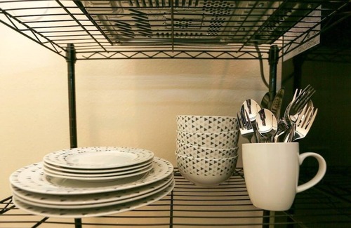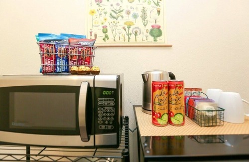You’ll enjoy 1 queen bed, a desk/chair, nice clean shower w good pressure and plenty of hot water, walk in closet w luggage rack, and a kitchenette for light meals and snacks.