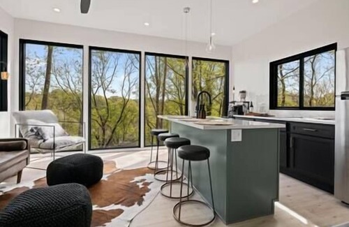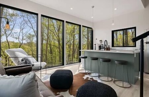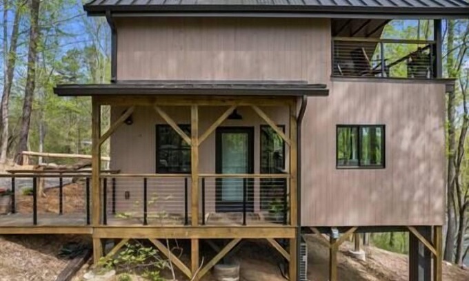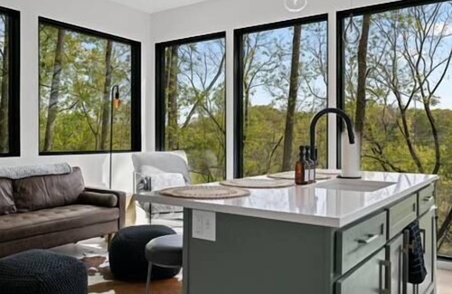 Bright, beautiful, and trendy tiny treehouse perched above the French Broad River. 1 bedroom with a super comfy King Bed, loft with king bed and futon, living room, kitchenette, and bathroom. Sprawling porch to enjoy the river. Hosts 5 adults comfortably. Can sleep up to 6 with option for additional air bed.