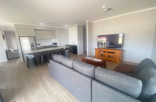 Open plan kitchen with large fridge/freezer with water dispenser, electric oven - gas stove top, microwave, Delonghi coffee pod machine (BYO pods), kettle, toaster, dishwasher, dining area with 8 seating table and chairs, childs high chair, living area with large smart TV, DVD player, L shaped lounge, coffee table. Separate sitting area with 1 x 2 seater lounge, 1 single lounge chair, CD player/radio.