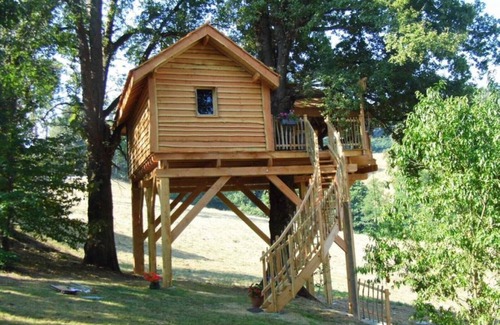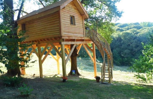 Treat yourself or offer a night for two included breakfast, alone in my cabin comfort all perched 6 meters high surrounded by a century old oak and heated from the first cold. On the terrace, a bubbling jaccuzi awaits you for optimal relaxation with views of the surrounding nature. I propose meal trays on order.