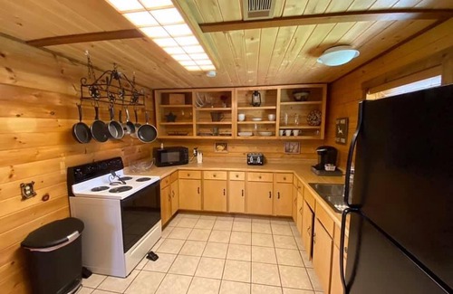The cabin has a two large porch areas with outdoor seating, a charcoal grill. It's only steps away from a REAL LIFE SALOON!