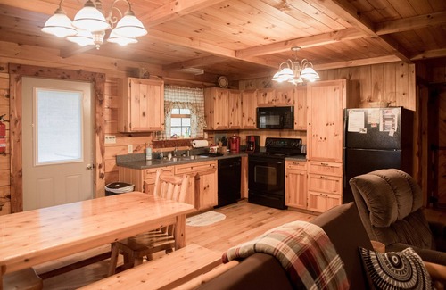 This 2 Bedroom with Queen Log Beds, master bedroom has TV/DVD/Satellite. Sleeps 6 Guests Comfortably. Large Livingroom with Sofa, futon and Chair Recliner for Relaxing and Watching Tv. Satellite Tv/ dvd. Kitchen/dining Room Has a Large Family Table with Chairs and Benches. Fully Equipped Kitchen. all Major Appliances, dishes, pots and Pans, silverware Furnished.