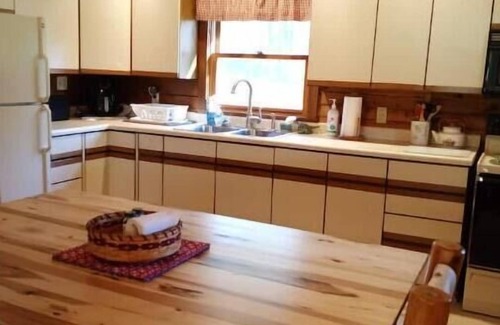 The cabin has an open concept with a loft overlooking the common area. There are two private bedrooms on the first floor and a full bath. The kitchen includes everything needed to make a meal. There is a coffee bar with Keurig & K-cups supplied. Appliances included are refrigerator, stove, microwave, toaster, crockpot, and air fryer. Also dishes, pots, pans, drinking glasses, cooking utensils, etc... The deck has picnic table with benches and chairs and grill. There are USB ports in the Kitchen to plug your charging cords into.