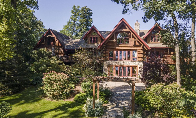 Log Cabin Mansion fronting Strawberry and Bass Lake with large oversized suites. | Cabin in Pinckney