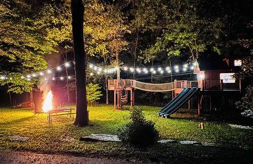 Discover serenity at our 20+ acres waterfront retreat. With over 6000 sq ft of space to accommodate 32+ guests. Nestled at the end of Kings Elbow Peninsula, enjoy a fully air-conditioned treehouse that sleeps two, or unwind with amenities like our game room, hot tub, fire pit, playground, and many outdoor games. Enjoy the large beach area just steps from the end of the driveway.