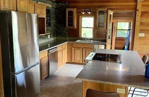 This spacious cabin offers all the amenities you need for a comfortable and memorable stay. Accommodating up to nine guests, it features a full kitchen, inviting living room with a queen bed sleeper sofa, and two beautifully designed bedrooms—one with a king bed and another with queen beds. You and your guests can gather around the dining table, while the expansive grounds beckon outdoor activities such as hiking or swimming in the private 5-acre spring-fed pond. Imagine exchanging vows amidst thousands of blueberry bushes and lush greenery, creating unforgettable memories for you and your guests.