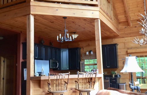 Beautiful, modern log cabin located on 9 private acres right off the Blue Ridge Parkway. At an elevation of 3,300 feet, the cabin has gorgeous views of the NC mountains. The cabin has a fully equipped gourmet kitchen, 4 bedrooms, 3 full baths and sleeps 8. The open floor plan is great for group gatherings, with floor to roof windows looking out on the distant mountains. The cabin has a large wraparound porch, a covered picnic table for outdoor dining, a large hot tub for soaking and relaxing after enjoying the many nearby outdoor activities, and a fire pit to gather around in the evenings. This property is located Ashe County and is perfect for those looking for peace and quiet in the middle of the woods, but with close proximity to outdoor activities like hiking and rafting, as well dining and other recreational activities in the West Jefferson and Boone areas. Couples, families and nature enthusiasts will fall in love with this place.