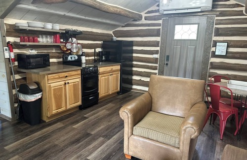 Welcome to Papa Bear at Lazy Bear Log Cabins, 2-Bedroom, 2-Bed (Queen/Queeen) 1-Bathroom with Walk-In Shower. The cabin is equipped with a fridge, stove, microwave, coffee pot with reusable filter and toaster. The kitchens are fully stocked with dinnerware, cups/glasses, cookware and utensils. We provide the bed linens, blankets, pillows, bath towels/wash clothes and kitchen wash clothes along with starter supply of toilet paper, paper towel, garbage liners and dish soap.