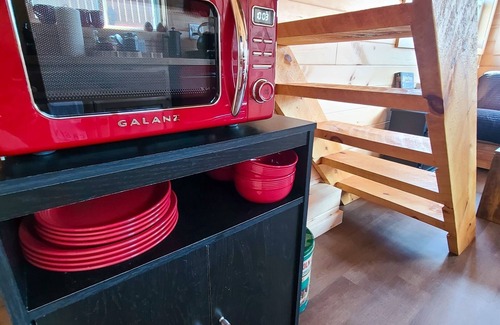 It sleeps up to four people with a queen bed loft like the days of old in prairie cabins and a futon double sofa sleeper. As you’re dozing off to sleep catch a chapter or two in “Little House on the Prairie” or browse the “Cabin Porn” book which features photos of other cabins from around the world.