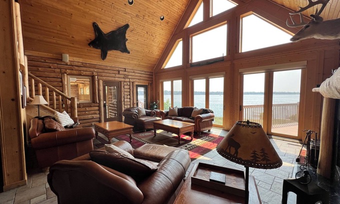 Don't miss the chance to plan a dream vacation in this incredible log home approx. 30 minutes from the Wisconsin Dells. Sunset Lodge is also great for anniversaries, family reunions, and weekend getaways. Enjoy picture-perfect sunsets and the following amenities: 4 bathrooms, 6 bedrooms, plus 2 full-size cribs, a youth bed and a sofa sleeper. The lodge consists of a 2-story great room with a fireplace and floor-to-ceiling windows overlooking the lake, dining room, fully equipped kitchen, laundry room, game room with a pool table and a 2nd floor roof deck. Sunset Lodge sleeps up to 12 adults and 10 children (total of 22 people).