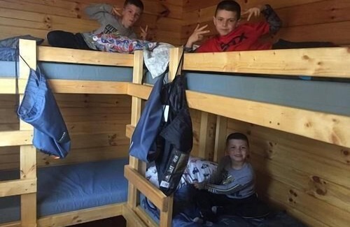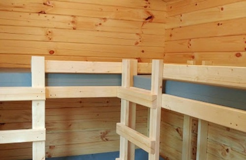 Queen bed and either two sets of single-size bunk beds, or one single-size bunk bed and a double-size futon (based on cabin assignment)