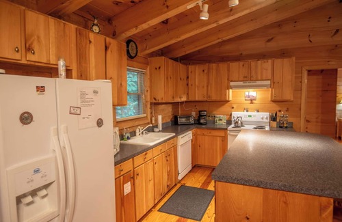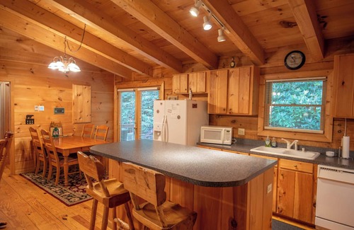 Bear's Den is a true log cabin, with wood walls and beamed ceilings. Its inviting open floorplan facilitates entertainment and family togetherness. You'll love the leather furniture, large stone fireplace and well-equipped kitchen, designed to make you feel at home. Off the great room you'll find two spacious bedroom suites, with queen-size beds and their own bathrooms. Each bath offers a Jacuzzi soaking tub and separate walk-in shower.