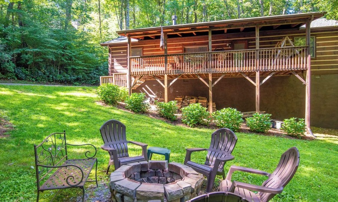 This vacation get-away is built for comfort and convenience inside; nature appreciation outside. The large sun deck includes a propane grill, plus furniture for lounging and dining. You won't know true relaxation until you've been in a hot tub in the woods, surrounded by trees and mountain laurels, with a massive dome of stars above. Unlike many mountain cabins, this home also offers a grassy yard for the kids and dogs to run around in!